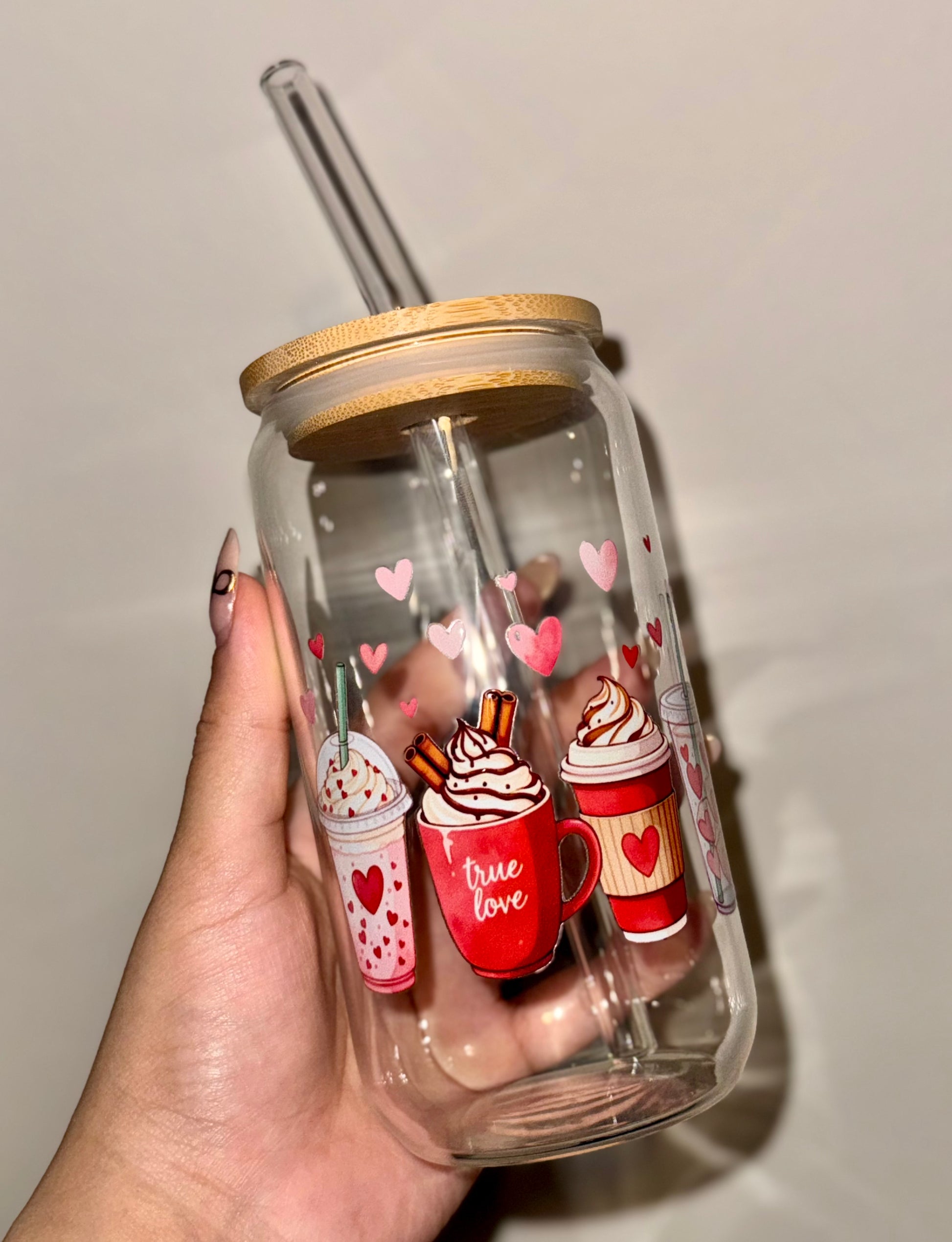 This cozy and romantic glass cup features adorable Valentine’s Day coffee drinks surrounded by floating hearts, capturing the perfect blend of caffeine and love! Complete with a bamboo lid and reusable glass straw, it’s perfect for iced coffee, lattes, or sweet treats on the go—an adorable must-have for coffee lovers this Valentine’s season!